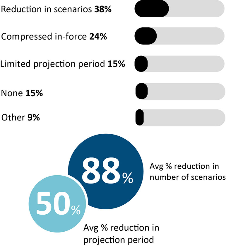 The most common modeling technique to reduce runtime is to minimize the number of scenarios used in projections; on average participants are reducing their scenario set size by 88 percent. One method used to test scenario reduction fidelity is to run the model with the full scenario set one time and then again with a reduced scenario set to determine the impact to key financial metrics. Companies typically perform periodic testing to confirm the tradeoff is still appropriate, and additional testing when economic environments move dramatically, or major assumption or methodology changes are implemented. It is worth noting that the tolerance of variance in metrics may be subject to a lower threshold for reported items that are reviewed by auditors or regulators as compared to thresholds used for internal analysis.