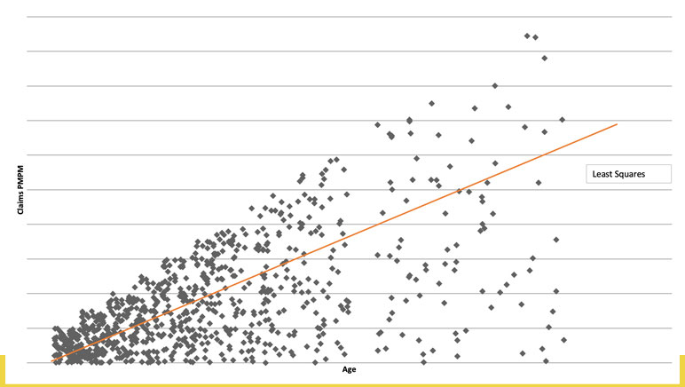 Each individual has a unique claims distribution that can be statistically estimated based on age, gender, morbidity, Rx utilization, etc. We can move from a single dimension to understanding risk along three dimensions: