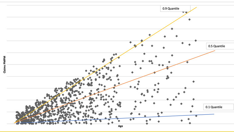 Ordinary linear regression predicts the mean, conditional on predictors. Quantile regression predicts the conditional median or any other percentile, with different coefficients (contribution to risk) at each level. The quantile chart (See Figure 1) suggests that the impact of increasing age is less for healthier members than for the sickest, with the slopes of the lines quantifying the difference.
