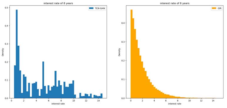 The simulation of interest rates generated by TCN_GAN is compared to those by CIR. Interest rates at the end of the eighth year of both methods are shown in Figure 9.
