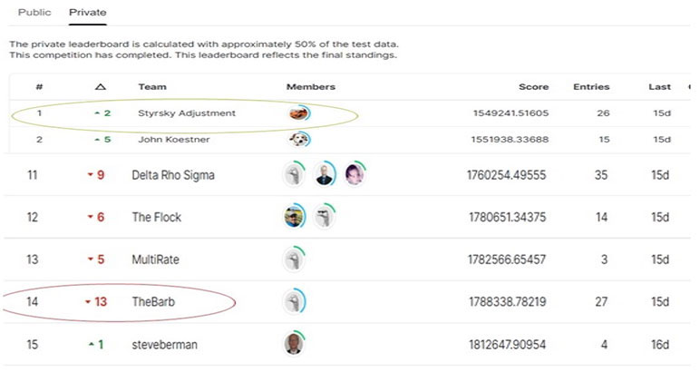 But now, look at the final private leaderboard in the picture below. Styrsky Adjustment moved to first and The Barb moved to 14th.