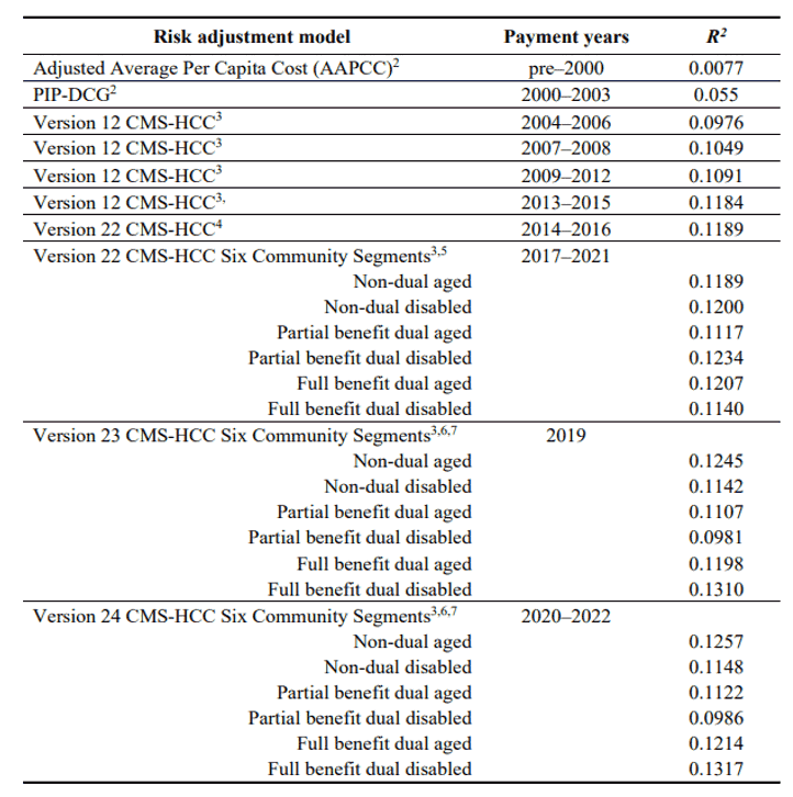 Table 1 presents a summary of the Medicare Advantage risk adjustment models and their explanatory power for individual beneficiary’s cost as measured by R2. It is followed by a description of each of the models.