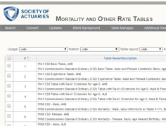 The Mortality and Other Rate Tables (MORT) application provides online access to a variety of rate tables of interest to actuaries and others. Users can search and download from over 2,500 data sets that include SOA experience mortality and lapse tables, regulatory valuation tables and population tables.